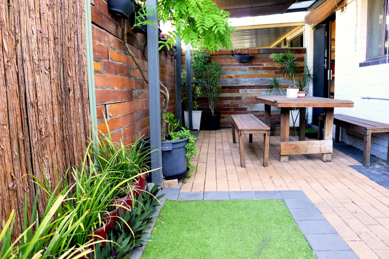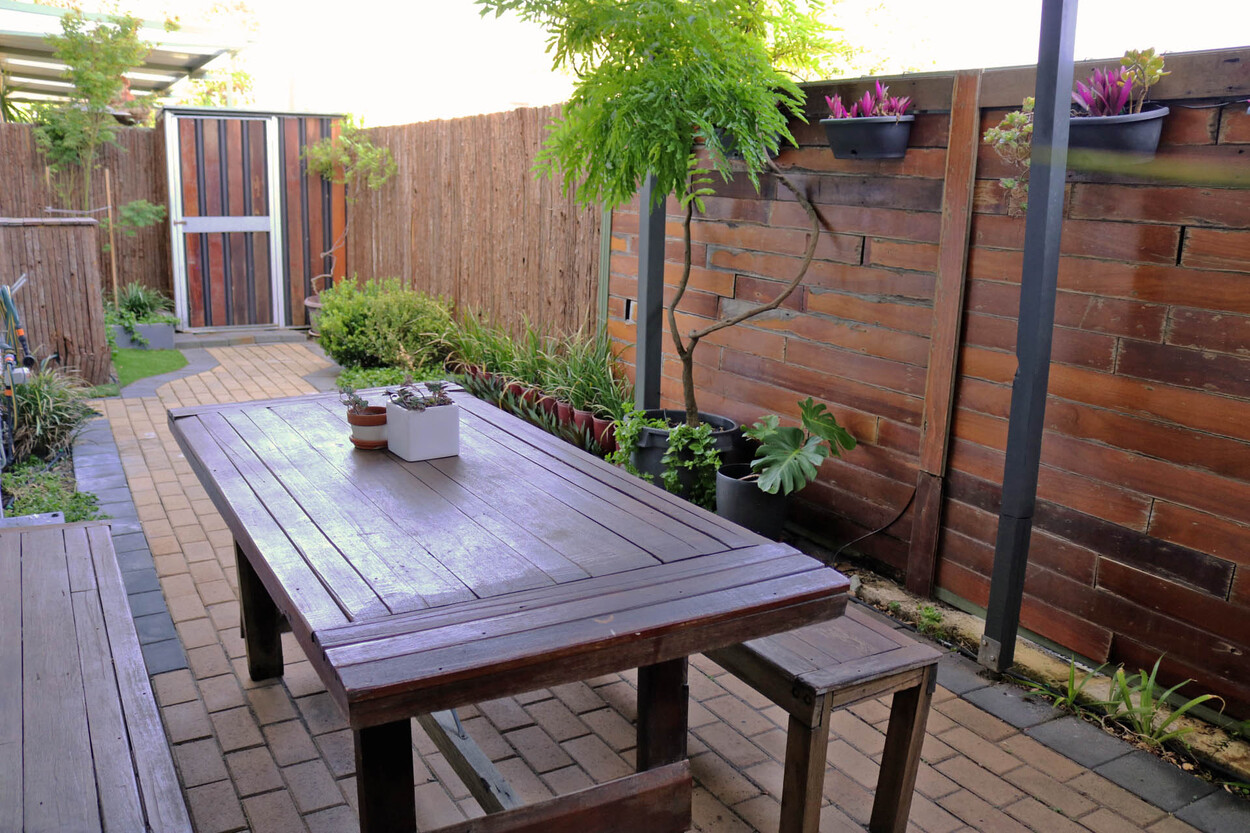 - Reticulated low maintenance private courtyard with jarrah table and bench seating.