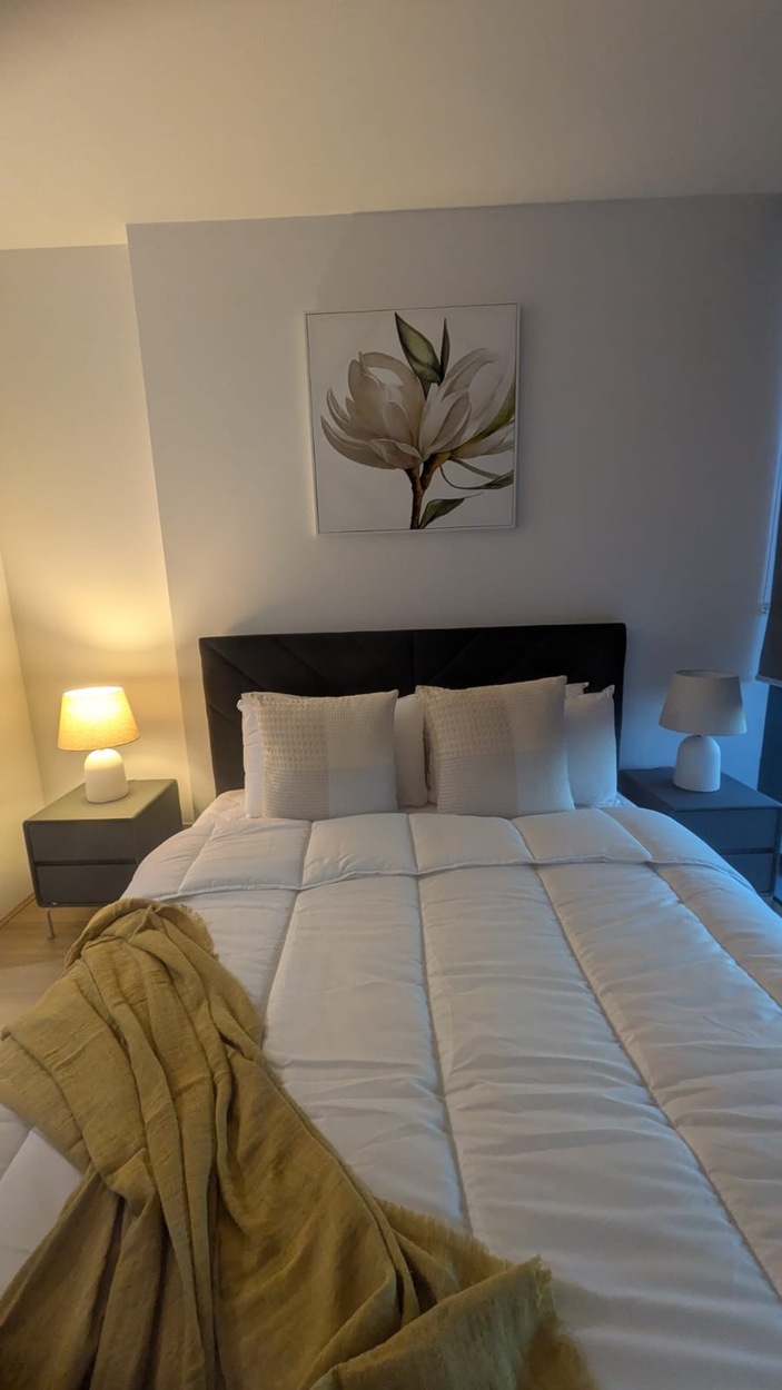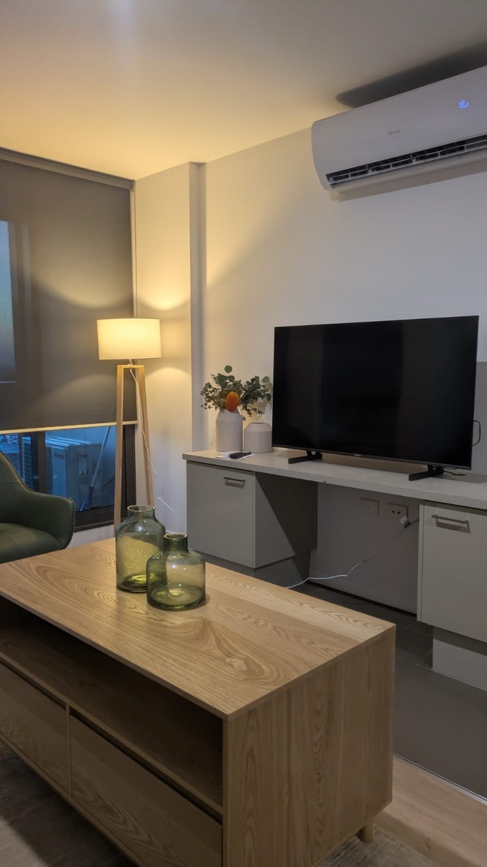 Step inside to a spacious, light-filled open-plan living area designed for comfort and style. The bedroom boasts floor-to-ceiling windows, a brand-new queen-sized bed, and built-in robes. The modern kitchen is equipped with a refrigerator, dishwasher, cooktop, oven, and generous cupboard space. The apartment also includes a laundry with a new washing machine and dryer, offering complete move-in-ready ease.